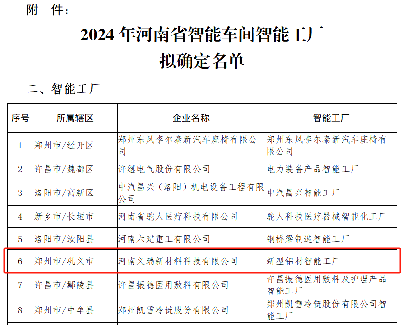 根據(jù)《河南省加快數(shù)字化轉(zhuǎn)型推動(dòng)制造業(yè)高端化智能化綠色化發(fā)展行動(dòng)計(jì)劃(2023—2025年)》(豫政〔2023〕32號(hào))、《河南省制造強(qiáng)省建設(shè)領(lǐng)導(dǎo)小組辦公室關(guān)于印發(fā)2024年河南省加快數(shù)字化轉(zhuǎn)型推動(dòng)制造業(yè)高端化智能化綠色化發(fā)展工作方案的通知》(豫制造強(qiáng)省辦〔2024〕13號(hào))、《河南省工業(yè)和信息化廳辦公室關(guān)于開(kāi)展2024年制造業(yè)數(shù)字化轉(zhuǎn)型示范遴選工作的通知》(豫工信辦〔2024〕30號(hào))等文件要求,經(jīng)主管部門(mén)審核,明泰鋁業(yè)下屬子公司河南義瑞新材料科技有限公司新型鋁材智能工廠被評(píng)為“2024年河南省智能工廠”。