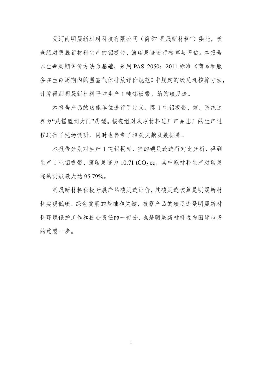 明泰鋁業(yè)子公司明晟新材料-產(chǎn)品碳足跡報告